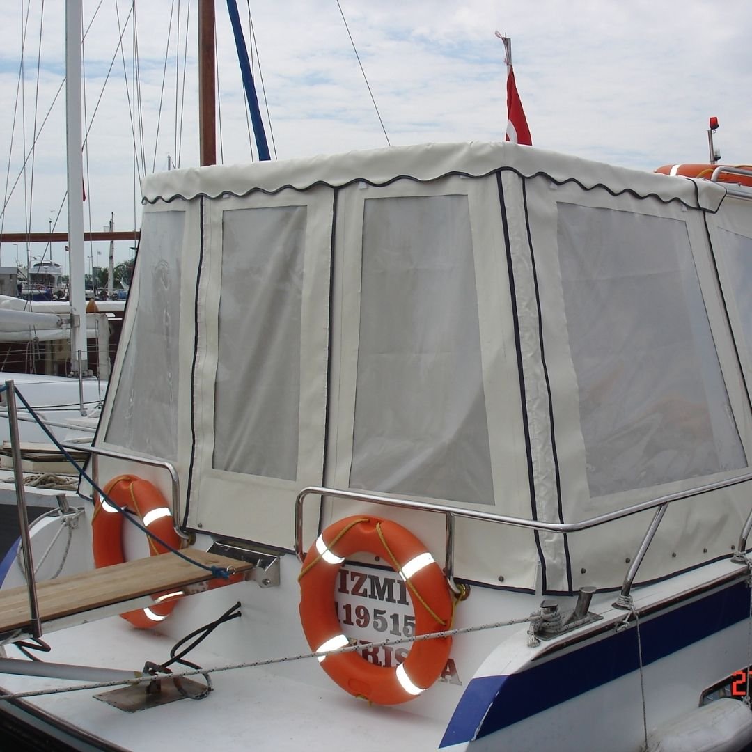 Yat ve tekne brandası, UV dayanımlı ve su geçirmez PVC yapısıyla deniz araçlarını rüzgâr, yağmur ve tuzlu sudan korur. Tekneye özel üretim.